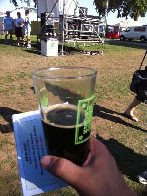 After brewing all day at Full Sail’s Riverplace location, recording a segment for the Beer Goddess, navigating Portland rush hour, checking into my hotel out by the airport, then navigating Portland’s MAX, I finally made it back down to the riverfront for the Oregon Brewers Festival Brewmasters’ dinner. They were serving beers that weren’t on the Oregon Brewers Festival list, so I thought I’d jump right in and try some cool, interesting beers. I’d never heard of an Imperial Black ESB, but the paper next to the server said, “dark and smooth as a Lou Reed lyric, the chocolatey maltiness and rich, fruity body are balanced perfectly with a subtle hop bitterness and dry roasty finish. Complex, yet light enough to enjoy in the summer sun, grab a pint and you’re sure to have a perfect day. 8.7% ABV, 21 Plato, 56 IBU.”
