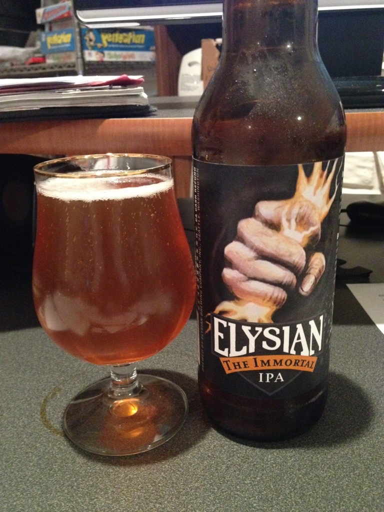 Bottle says, “Aggressive, yet well-balanced, The Immortal IPA is a Northwest take on a classic English style, golden-copper in color and loaded with New World hop flavor and aroma.”
