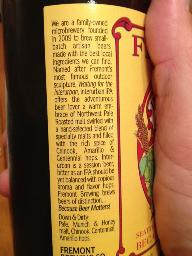 I’m getting ready for a business trip out to Seattle, and I’ve been trying to have a few of the beers my cousin sent me a few weeks ago from Seattle. I’m hoping that it’ll help me determine a few breweries I must stop at while I’m there. In doing a little prep work for my trip, it looks like this brewery has a great “urban beer garden,” so I’m hoping this beer will be the motivation I need to stop there.