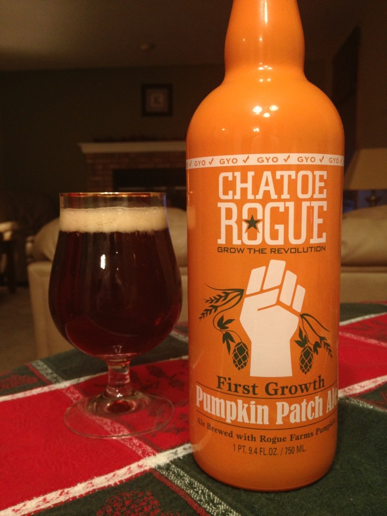 The bottle says, “Dedicated to farmers and fermenters GYO is a Rogue Ales term for grow your own. We made this ale with our own hops, barley and pumpkins. Created with pumpkins grown on Rogue’s Micro hop and pumpkin yard in Independence, Oregon. Fresh pumpkins are picked, loaded into our truck, driven immediately 77 miles to our brewery in Newport, Oregon, quickly roasted, and pitched into the brew kettle.”