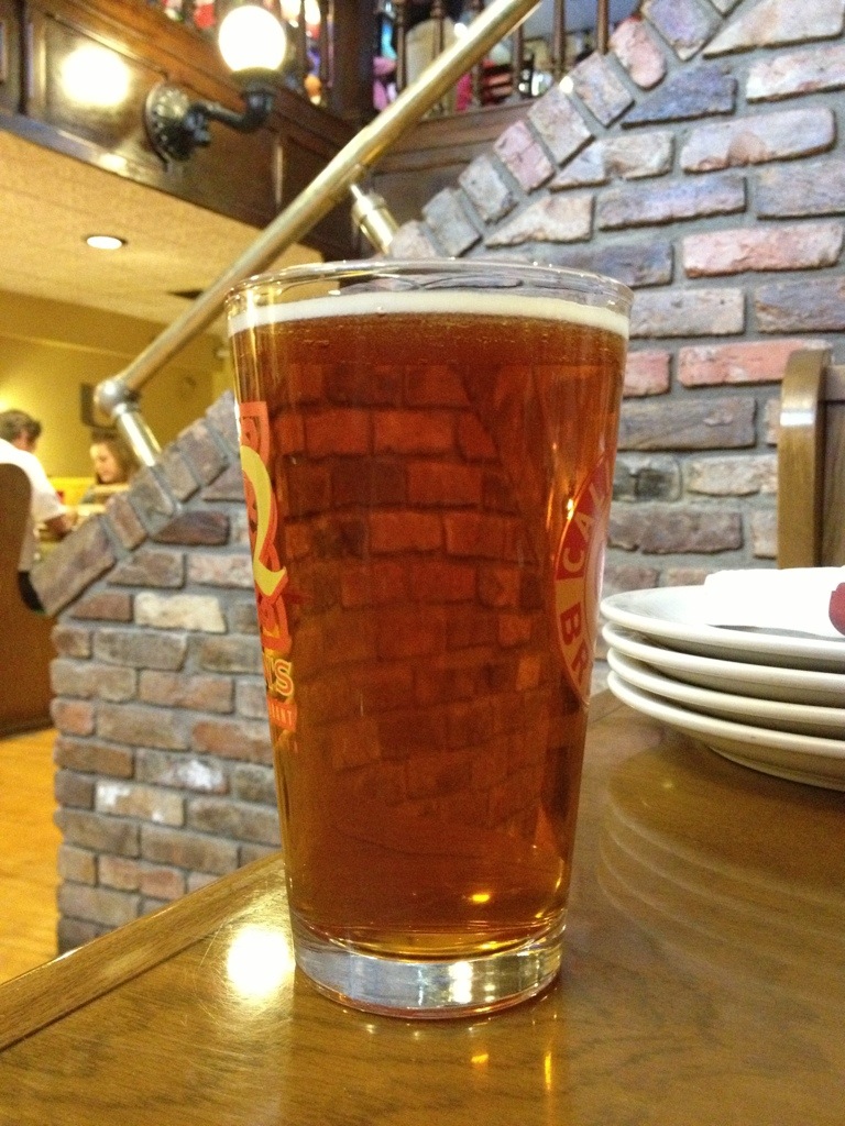 Food Pairing: As I mentioned, hoppy beers like this go nicely with the tomato-basil cheesebomb here at Flinger’s, since the hop flavors mix well with the cheese and basil flavors. Other good pairings would probably be a thick, juicy cheeseburger to contrast the flavors, or a pasta with white sauce and red & yellow peppers to compliment it.