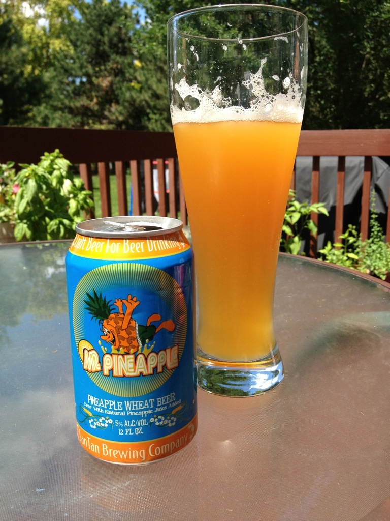 The can says, “Mr. Pineapple was conceived for SanTan Brewing Company’s annual luau day. Fresh pineapple juice is added to a traditional wheat beer during fermentation to add a refreshing tropical flavor to this fruity ale. The pineapple is balanced with a firm malt character and a slightly spiced hint of clove. Mr. Pineapple is the perfect way to beat the Heat on a warm summer day!”