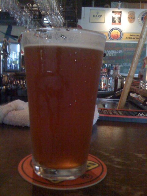 It was a hazy darker orange color and had a thin head on it. The hop aroma was immediately noticeable, and it seemed to be primarily a citrusy and grassy type smell.