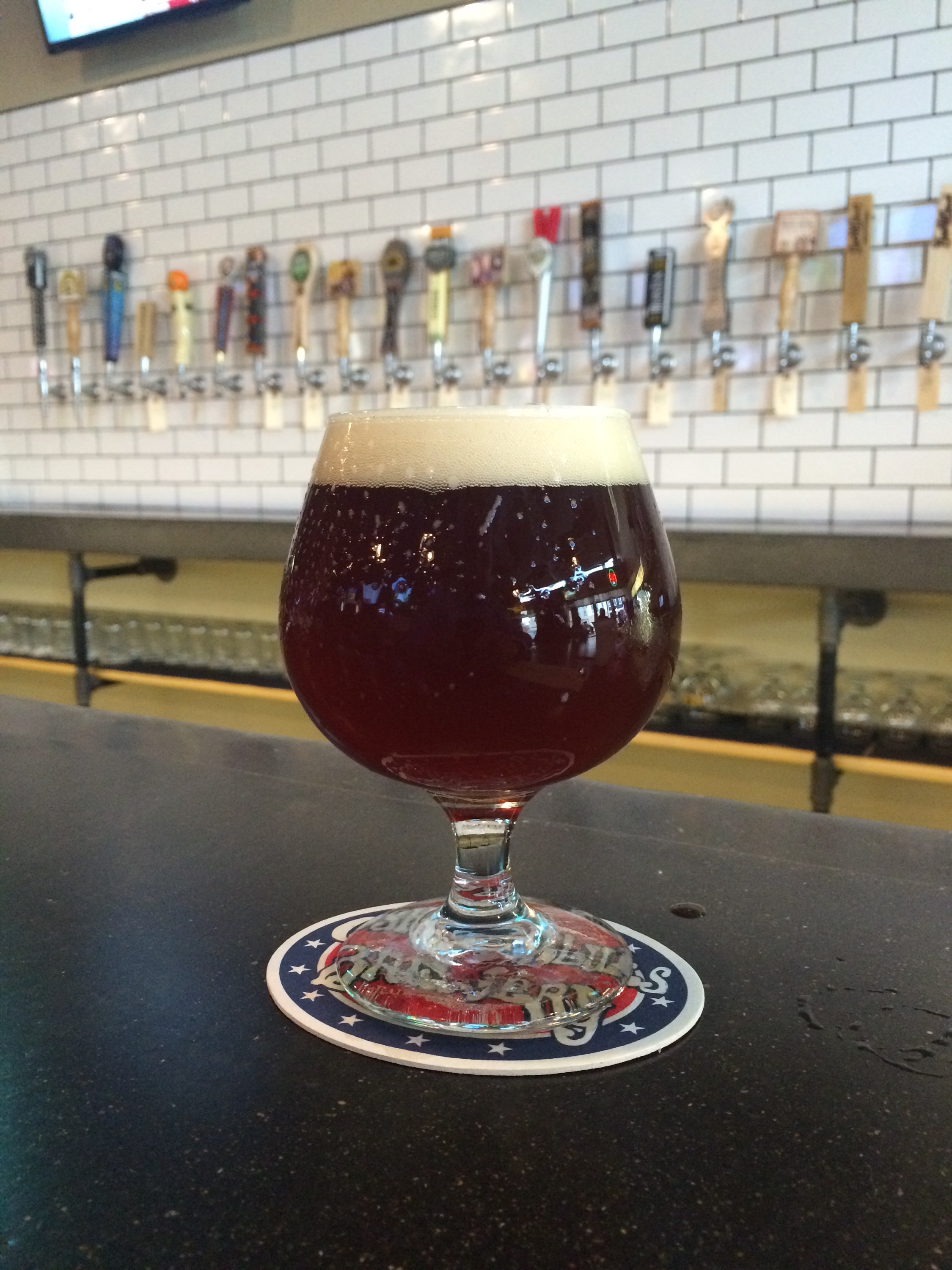 Appearance & Aroma: It’s a brick-red, sort of brown color, and fairly hazy. It had an overflowing, slightly off-white head that fell quickly to just a creamy ring around the edge of the glass. The aroma was malty-caramelly, with a bourbon barrel-like vanilla smell.