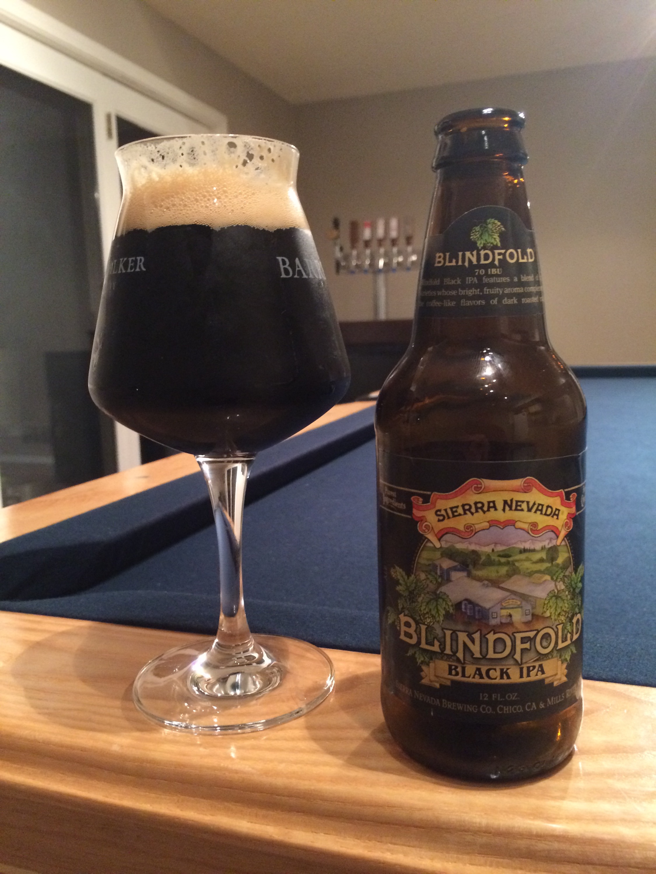 The bottle says, “Blindfold Black IPA features a blend of hop varieties whose bright, fruity aroma complements the coffee like flavors of the dark roasted malts.”
