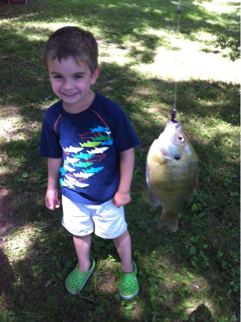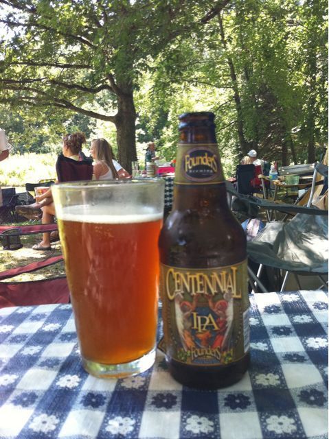 We had our homebrew club picnic today at the hideout of one of our club members. It’s in the middle of nowhere, but it is a great place with a small pond, a big grill, and a little cabin. The pond is stocked with big fish, which my son and I enjoyed catching most of the afternoon (at least when we weren’t swimming or paddling around in the canoe).  You can see the photos below. When we stopped for lunch, it was the perfect time to take a break from sampling others’ homebrew and break out the Founder’s brew I brought for the afternoon. The bottle said it had 65 IBU’s and was 7.2% ABV.